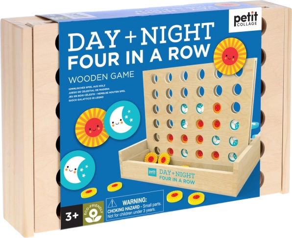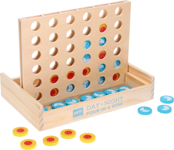 Jocul din lemn patru la rând ziua și noaptea necesită nu doar gândire rapidă, ci și capacitate de planificare strategică. Scopul este să plasezi patru jetoane consecutive pe grilă. Jetoanele au un design atrăgător de soare și lună care va captiva și încânta jucătorii mici și mari deopotrivă.