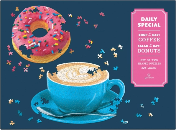 Bucură-te de distracție dublă cu setul special de puzzle 2‑în‑1 cu motive de gogoașă roz și ceașcă de cappuccino. Piesele cu forme neregulate se îmbină perfect și asigură o asamblare fluentă. Puzzle-ul este ambalat într-o cutie rezistentă și stilată – ideală pentru cadou. Aproximativ 625 de piese, tipărire de calitate și forme originale pentru o experiență de asamblare și mai plăcută.