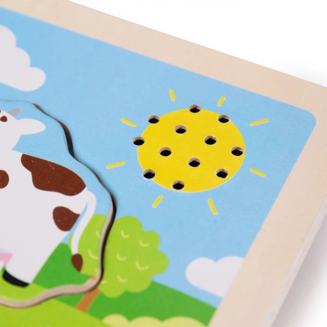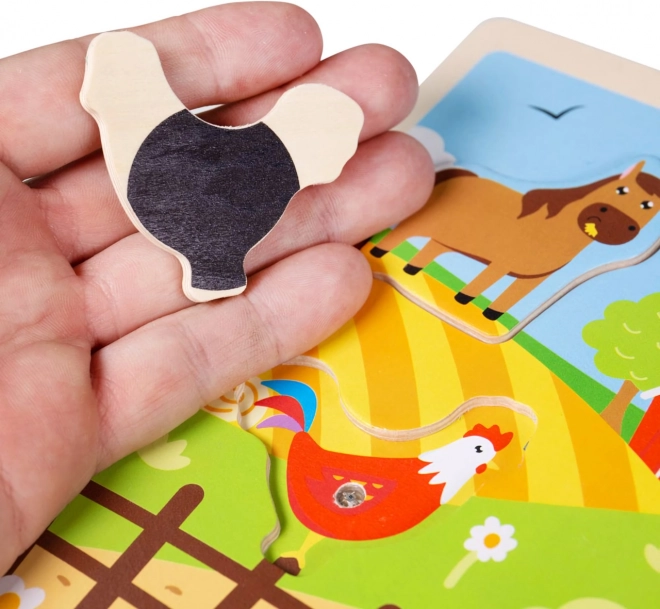 Puzzle-ul intercalat din lemn cu sunete - Ferma este conceput nu doar pentru a distra, ci și pentru a educa. Piesele din lemn sunt dimensionate și formate pentru micile mâini ale copiilor, sunt plăcute la atingere și ajută la stimularea tactilă. Culorile vibrante și fețele drăgălașe ale animalelor captează cu ușurință atenția copiilor. Produsul este realizat din lemn de calitate, provenit din surse responsabile și tratat cu vopsele non-toxice.