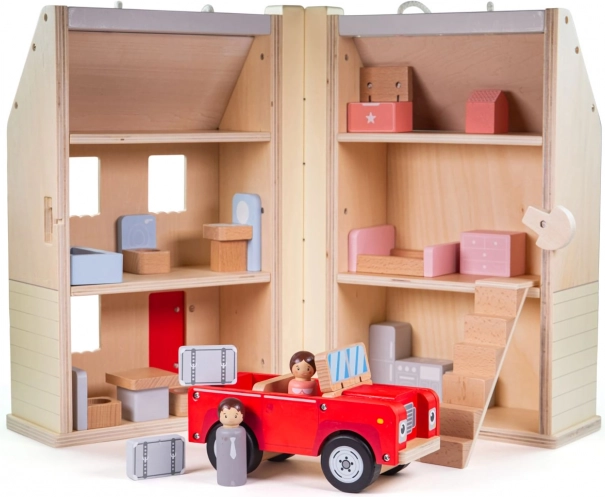 - Set complet: 3 etaje, 13 piese de mobilier, 2 figurine și mașinuță din lemn