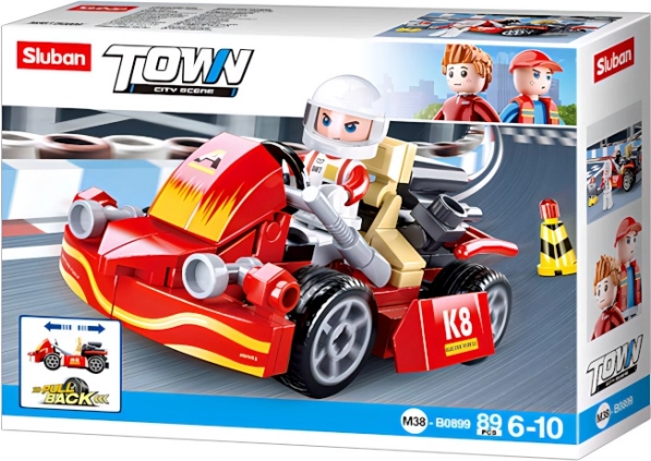 Acest set distractiv oferă tot ce iubesc copiii: viteză, creativitate și rezistență. Datorită mecanismului cu arc, kartul chiar pornește după armare, ceea ce stimulează jocul interactiv și imaginația. Figurinele SLUBAN au părți rotative și oscilante, astfel încât pilotul se așază ușor la volan și se poate antrena pe pistă.