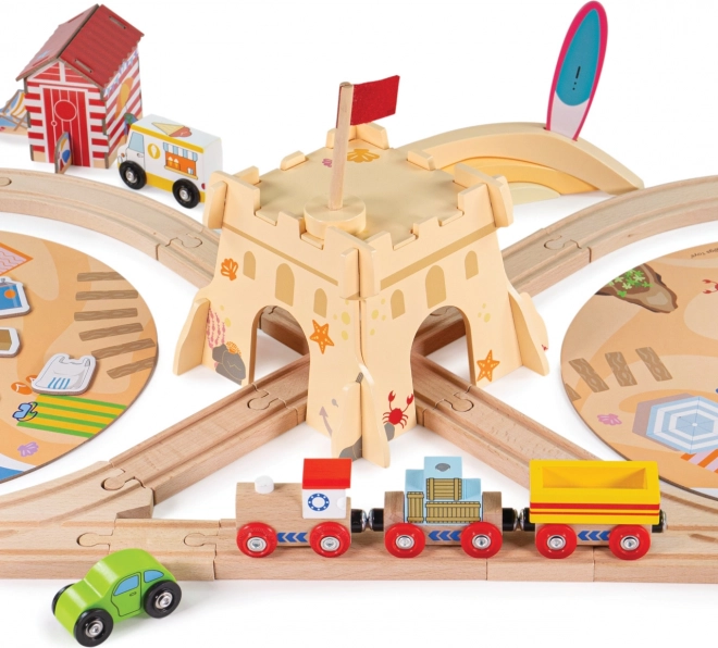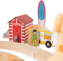 Acest circuit feroviar de coastă aduce multă distracție creativă și învățare într-un singur set. Copiii pot circula pe traseu, pot trece prin marele castel de nisip, pot trece pe lângă căsuțele de plajă colorate și, în același timp, pot învăța să sortese deșeurile datorită plăcilor magnetice cu închidere. Totul este realizat din materiale obținute responsabil, cu vopsele și lacuri sigure.