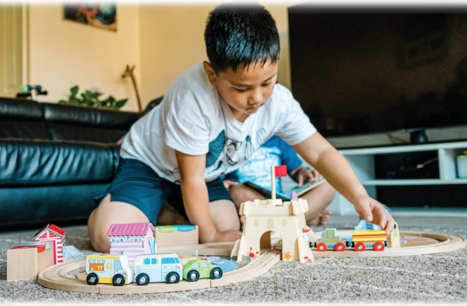 Setul este ideal pentru joacă în familie sau la grădiniță. Datorită compatibilității cu circuitele feroviare din lemn ale altor mărci, îți poți extinde ușor colecția cu noi trasee și accesorii. Dimensiunea pieselor este adaptată copiilor mici, care își dezvoltă prin joc motricitatea fină, coordonarea mână–ochi și imaginația.