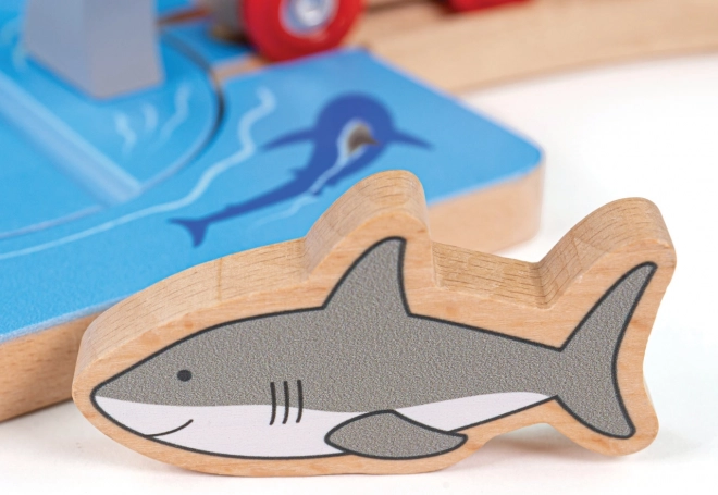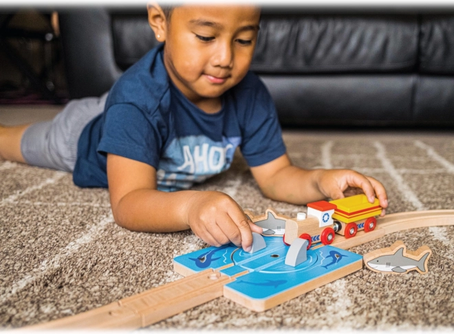 Vârtejul cu rechini transformă orice cale ferată din lemn într-o misiune oceanică palpitantă. Copiii manevrează secțiunea rotativă a traseului și decid dacă trenul trece în siguranță pe lângă aripioarele rechinilor. Acest element de joc aduce tensiune, povești și implicare activă.