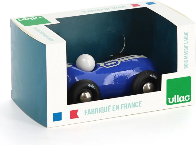 Mașina de curse Vilac Streamline PM în culoare albastră impresionează prin designul atemporal, plăcut rotunjit și execuția precisă. Caroseria din lemn este lăcuită prin metoda tradițională de imersie, asigurând un finisaj durabil și uniform. Roțile din plastic, cu rulare lină, fac din deplasare o plăcere – atât pe podea, cât și pe raft ca decorațiune stilată.