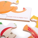 Puzzle-ul conține ilustrații vii, care îi ajută pe copii să identifice vizual diverse tipuri de fructe, precum pepene, portocală sau banane.