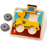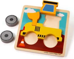Puzzle de inserție pentru cei mici, cu motiv de excavator, realizat din materiale de înaltă calitate, obținute în mod responsabil. Un instrument excelent pentru dezvoltarea motricității fine, gândirii logice și recunoașterii formelor și culorilor.