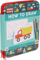 Instrucțiuni clare și ușor de urmat îi învață pe copii să deseneze 36 de vehicule diferite – de la biciclete și mașini la baloane și bărci.