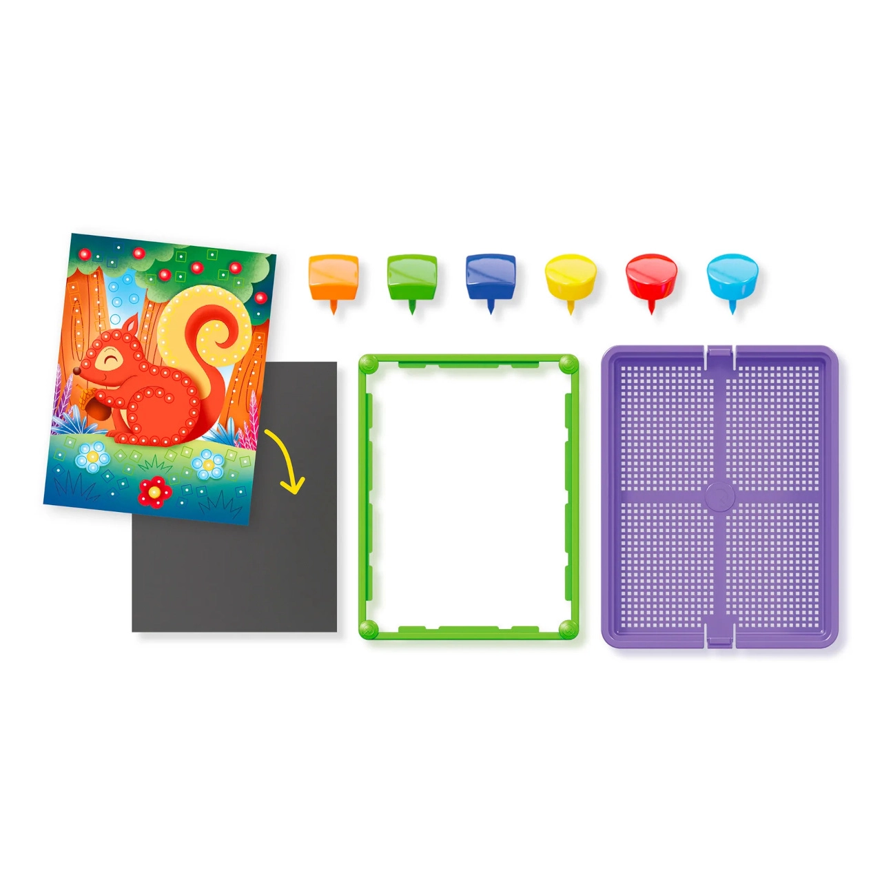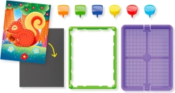 Acest mozaic colorat cu pini îi atrage pe copii prin posibilitatea de a crea imagini din cardurile pregătite sau din propriile idei. Datorită introducerii intuitive a pinilor în placă, copiii exersează prinderea, răbdarea și percepția vizuală. Piesele robuste din plastic și cadrul asigură stabilitate și un transport ușor.
