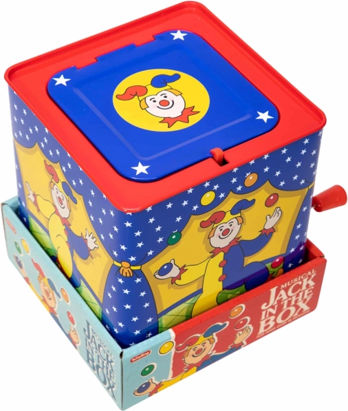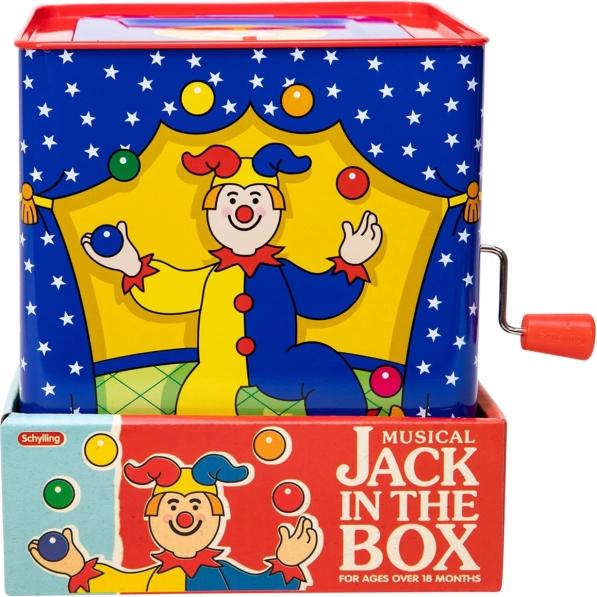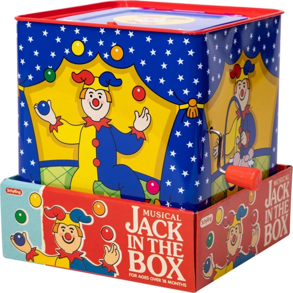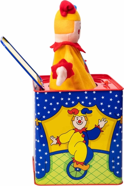 Cutia muzicală clovn este o jucărie atemporală realizată din tinichea cu un design frumos, care garantează ore de distracție. Pur și simplu rotiți manivela și ascultați melodia unui cântec cunoscut „Pop Goes The Weasel”, până când clovnul colorat apare.