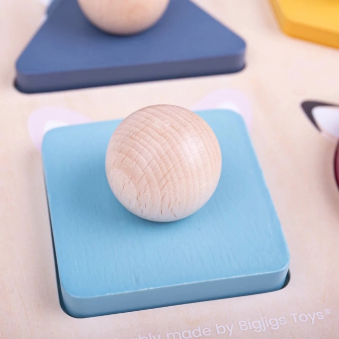 Acest puzzle din lemn de înaltă calitate este ideal pentru mânuțele copiilor mici. Copiii potrivesc fiecare formă în deschiderea corectă, iar la final apare o imagine colorată cu animăluțe. Mânerele mari din lemn facilitează manipularea, susțin priza corectă și conduc în mod natural la dezvoltarea motricității fine.