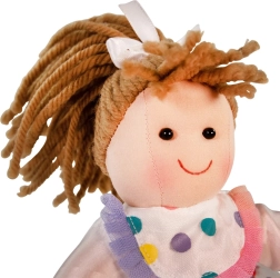 Corpul textil moale, ochii brodați și părul delicat din fir oferă siguranță chiar și pentru cei mai mici copii. Ideală ca prima păpușă de alint.