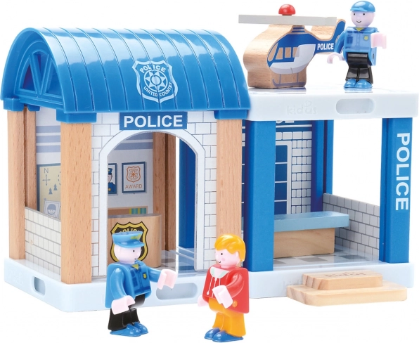 Stație de poliție detaliată, cu mașinuță și elicopter, care promovează jocul interactiv și imaginația.