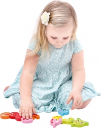Puzzle colorat din lemn în formă de râmă îi ajută pe copii să-și însușească prin joc succesiunea și numerele de bază. Piesele robuste sunt ușor de apucat, viu colorate și mențin atenția. Fabricat din lemn masiv cu vopsele sigure, livrat într-un tub practic cu mâner pentru transport facil.