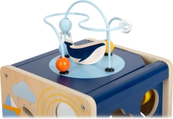 Cubul oferă elemente interactive precum labirinturi cu mărgele, trasee și potrivire de forme, care sprijină abilitățile de recunoaștere a culorilor și formelor.