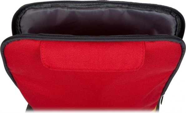 Rucsacul în combinație roșu-galben are fermoar dublu pentru deschidere rapidă, bretele de umăr reglabile pentru purtare confortabilă și două catarame pentru prinderea accesoriilor. Componentele din lemn și plastic sunt plăcute la atingere și rezistă jocului intens.