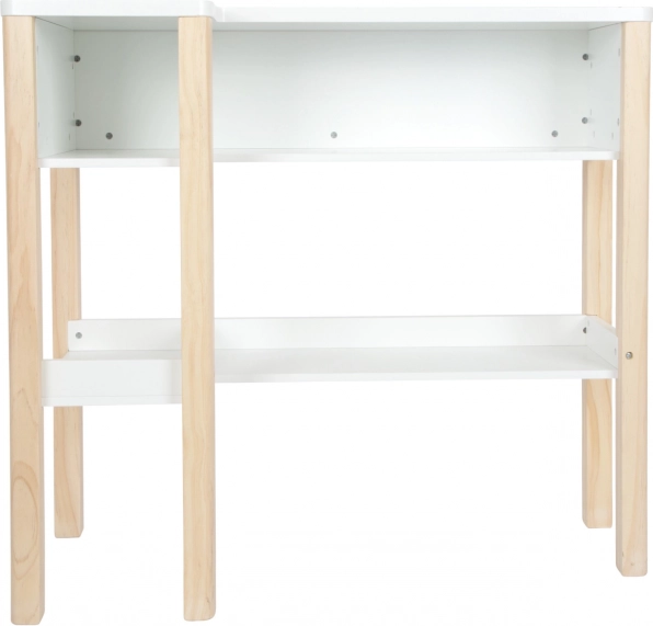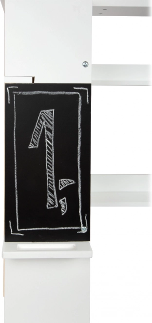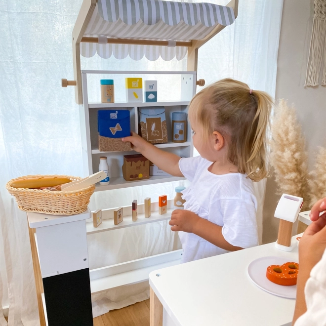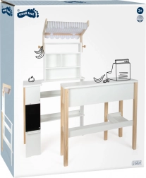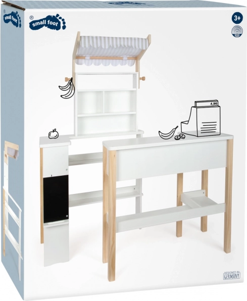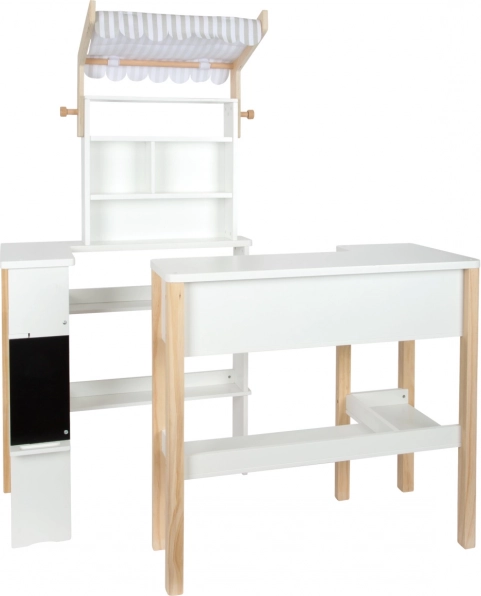Standul de vânzare din lemn SMALL FOOT Fresh transformă camera copilului într-o mică piață. Aspectul minimalist în alb și lemn natural se potrivește oricărui interior, iar marchiza detașabilă în dungi îi conferă un look autentic de magazin. Tabla pe care se poate scrie, cu poliță pentru cretă, invită la creativitate pentru înscrisuri și etichete de preț.