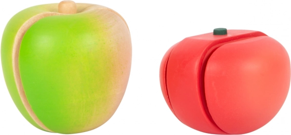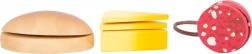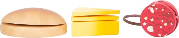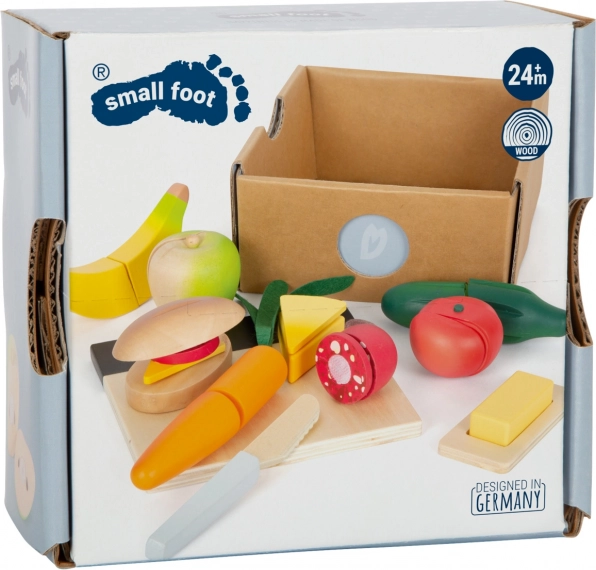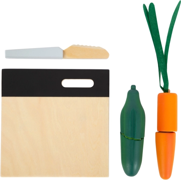 Acest set de calitate, din lemn robust, aduce tot ce le trebuie micilor bucătari: un tocător pe care se poate scrie cu cretă, un cuțit din lemn sigur și o selecție bogată de alimente – roșie, castravete, morcov, măr, banană, brânză, salam, unt și produse de panificație. Piesele individuale sunt ținute împreună cu ajutorul ariciului (scai), astfel încât copiii le pot „tăia” și reasambla iar și iar.
