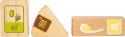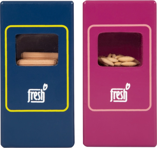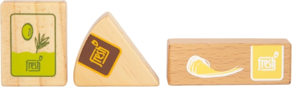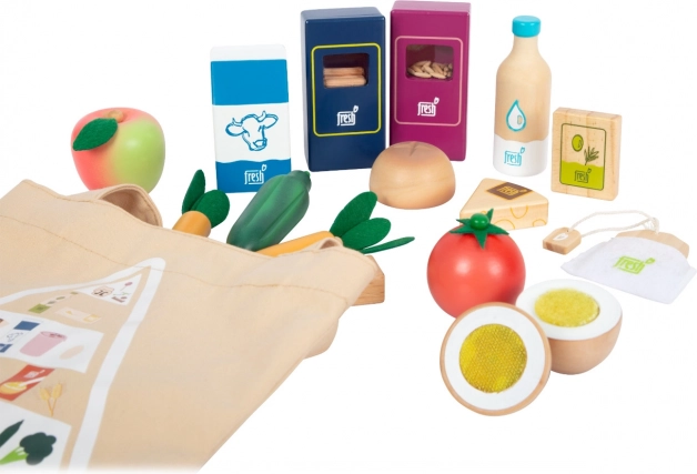 Setul de alimente vegetariene Fresh oferă copiilor tot ce au nevoie pentru jocuri creative de gătit și de magazin. Piesele din lemn precum lapte, unt, brânză, ulei, ouă, orez, paste, produse de panificație, măr, roșie, castravete și morcov sunt completate de o sticlă cu apă și un săculeț de ceai. Detaliile realiste, inclusiv fereastra transparentă la ambalajele de orez și paste (scot sunete la agitare), sporesc atractivitatea și autenticitatea jocului.