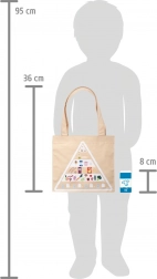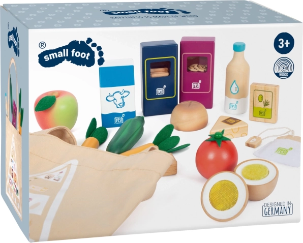 Datorită sacoșei din bumbac cu imprimeu al piramidei alimentare, copiii învață jucându-se despre alimentatia corectă, ecologie și cumpărături responsabile. Construcția durabilă din lemn și textile este plăcută la atingere și ideală pentru bucătării de jucărie și standuri de vânzare. Setul este compatibil cu alte produse din gama „Fresh”.