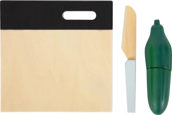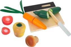Include un cuțit din lemn, un tocător și legume. Ambalajul reutilizabil servește la depozitarea jucăriei și îi învață pe copii gândirea ecologică.
