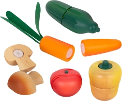Acest set din lemn pentru tăiat legume este ideal pentru jocuri de magazin, gătit și mici provocări culinare. Ardeiul, ciuperca, roșia, castravetele și morcovul sunt împărțite în părți și unite cu bandă cu arici, astfel încât copiii le pot „tăia” iar și iar cu un cuțit din lemn sigur. Include și un tocător cu orificiu pentru agățare și parte tip tablă pentru scris cu cretă – grozav pentru liste de cumpărături sau rețete.