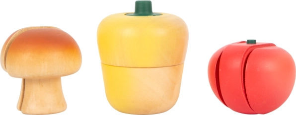 Roșia, ardeiul, castravetele, morcovul și ciuperca sunt împărțite în jumătăți și se țin împreună datorită benzii cu arici – ideale pentru exersarea tăierii în siguranță.
