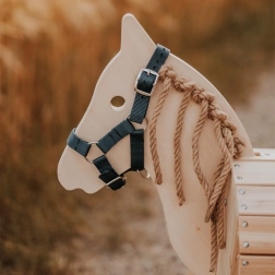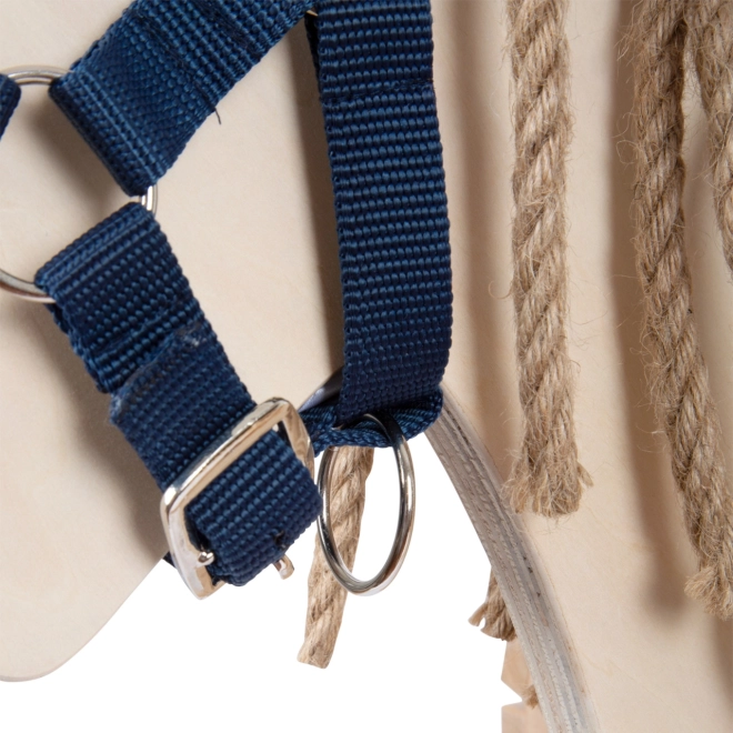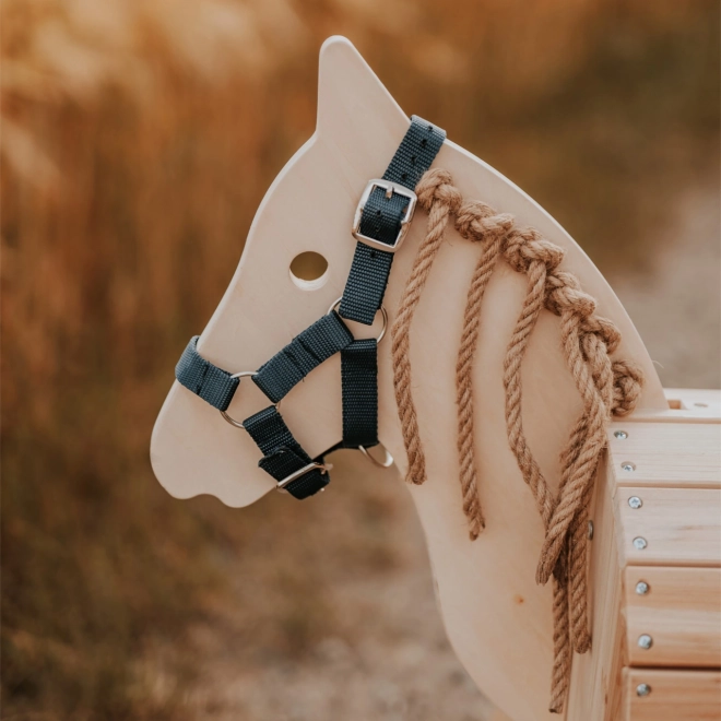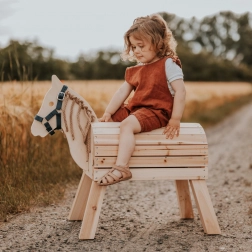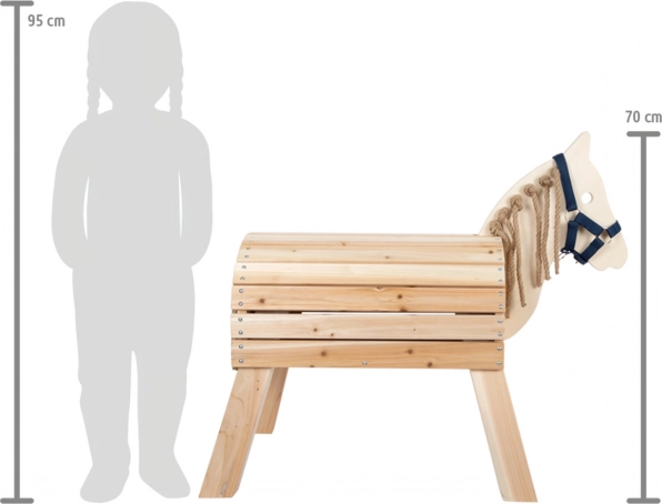 Calul din lemn pentru copii este fabricat din lemn durabil netratat, care poate fi tratat cu lac de protecție dacă este necesar. Înălțimea spatelui calului este de 50 cm, ceea ce facilitează accesul chiar și pentru copiii mai mici. Calul stă pe picioare stabile, ceea ce îl face sigur pentru joaca acasă și în exterior. Pachetul include un ham, la care se poate atașa o funie de conducere pentru o interacțiune mai mare în timpul jocului. Calul din lemn susține dezvoltarea imaginației și motricității fine a copiilor datorită coamei și cozii din sisal, pe care le pot împleti și pieptăna.