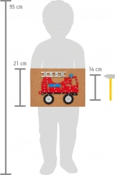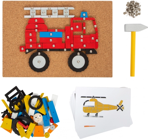 Set extins de joc creativ cu tematică de transport, care conține o bază de plută, un ciocan de lemn și multe piese de lemn de diferite forme și culori. Ajută la dezvoltarea creativității, abilității și coordonării mână-ochi.