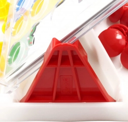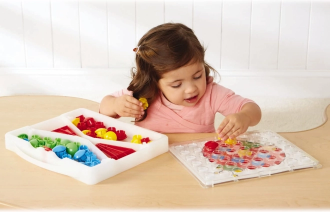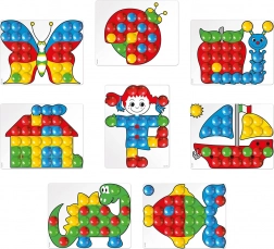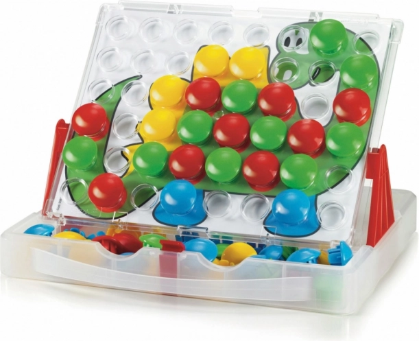 Mozaicul în valiză practică le permite copiilor să compună imagini vesele după șabloanele incluse sau după propria fantezie. Placa poate fi introdusă în suporți și utilizată și în poziție verticală pentru un joc și mai confortabil. Pionii mari și colorați sunt siguri și ușor de apucat chiar și pentru mâinile mici ale copiilor.