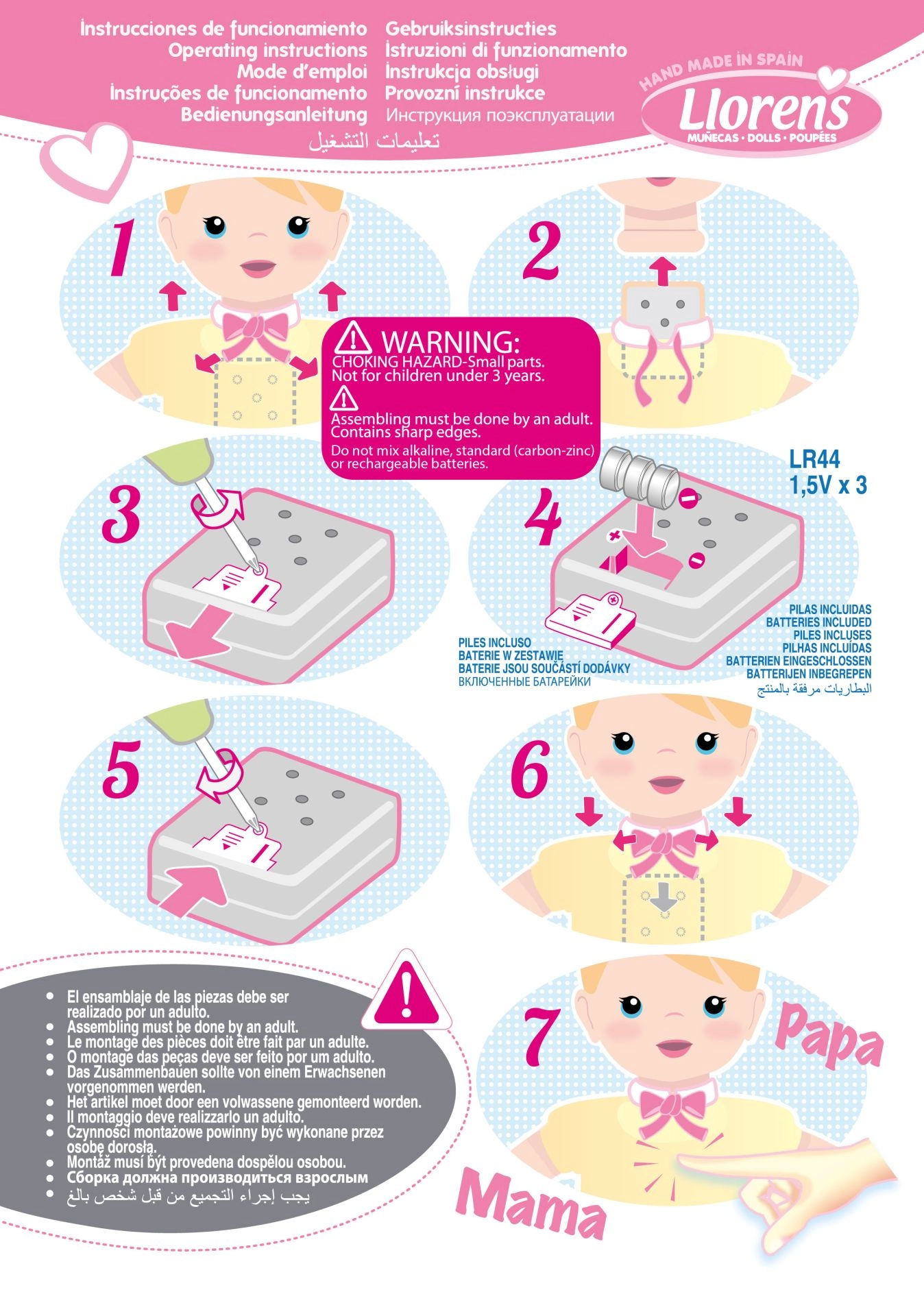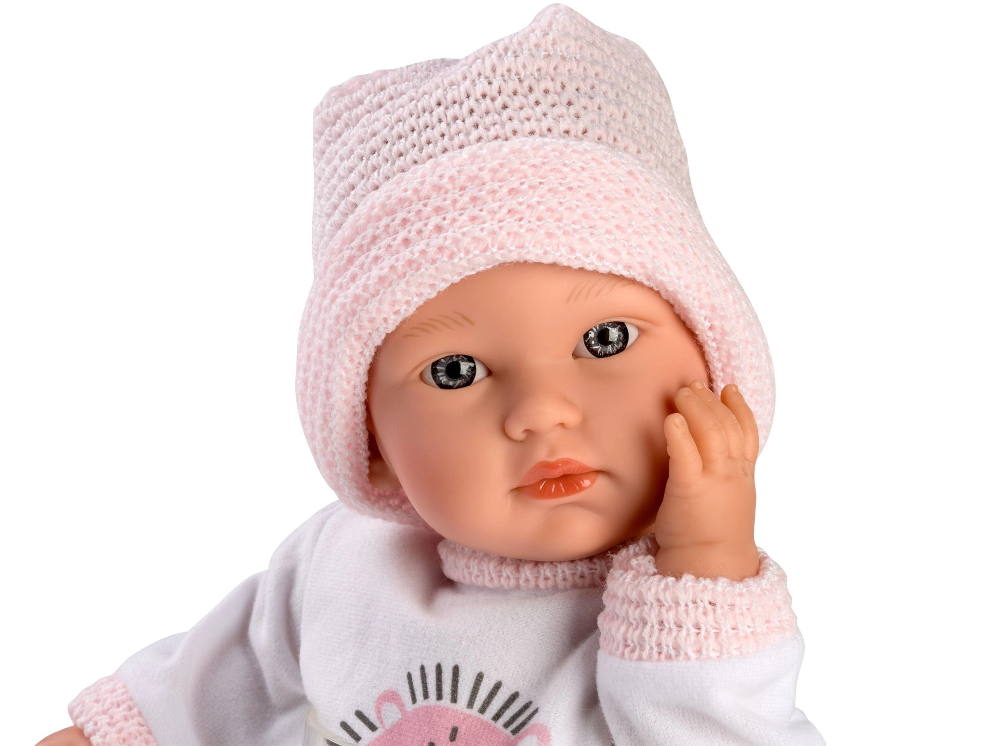 La apăsarea burticii, păpușa plânge și spune „mama, tata”, încurajând jocul empatic și dezvoltarea abilităților sociale. Hăinuțele cu imprimeu drăguț și căciulița tricotată se îmbracă și se scot ușor, ceea ce dezvoltă motricitatea fină.