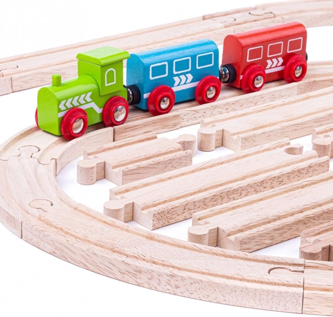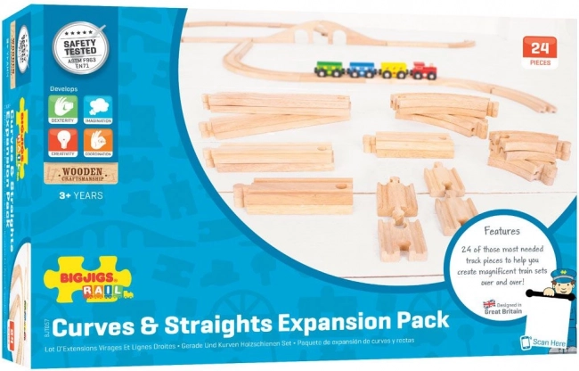 Setul de șine de lemn Bigjigs Rail oferă copiilor oportunitatea de a se juca la nesfârșit și de a-și dezvolta creativitatea. Cu 24 de piese, pot crea cu ușurință diverse configurații de trasee și povești interactive. Datorită materialelor naturale de calitate și compatibilității cu alte mărci, acest set este ideal ca supliment sau extindere pentru traseul de trenuleț existent.