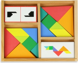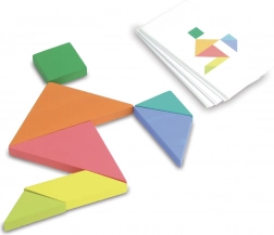 În set găsiți două seturi complete de tangrame pentru un duel față în față, peste 100 de cartonașe cu provocări și reguli clare. Piesele din lemn sunt plăcute la atingere, rezistente și ideale pentru joacă repetată acasă sau la școală.
