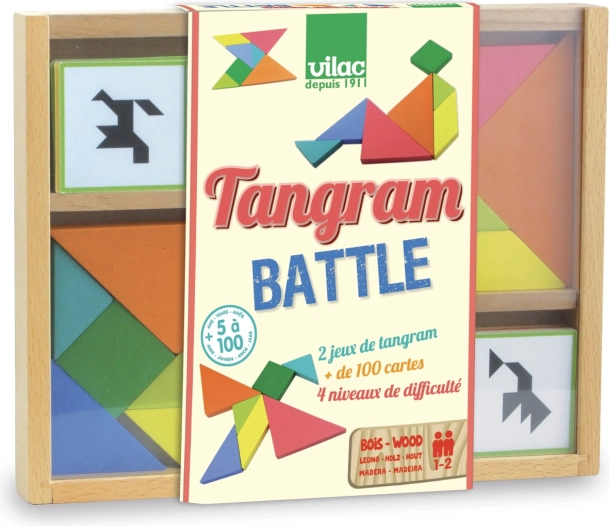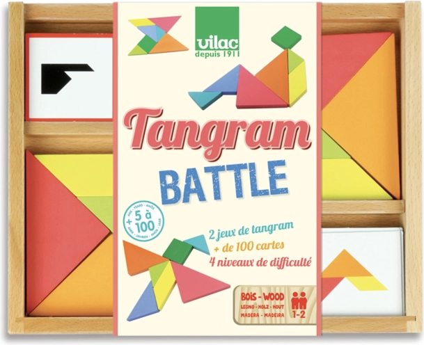 Duelul de tangrame de la VILAC este un joc de societate rapid și captivant care dezvoltă logica, concentrarea și creativitatea. Scopul este să potrivești cât mai repede piesele colorate în silueta ilustrată pe cartonaș. Datorită nivelurilor variate de dificultate, jocul este potrivit pentru întreaga familie.
