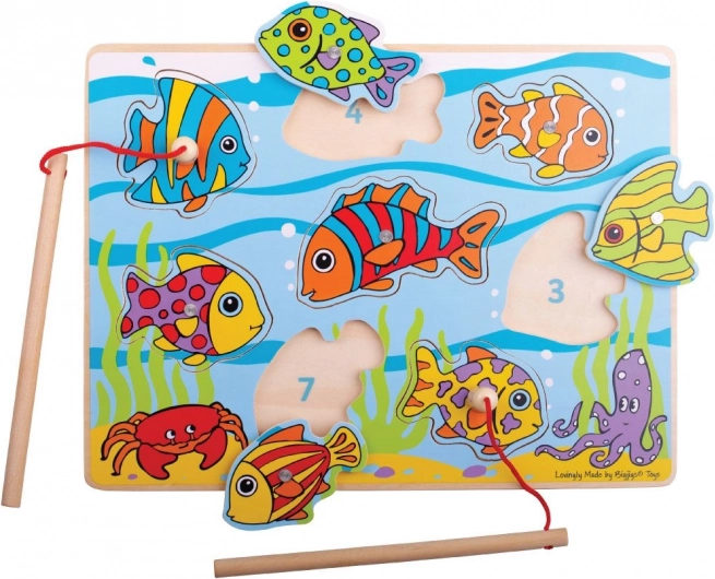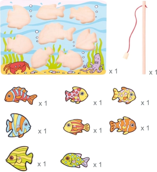 Joc distractiv din lemn pentru cei mici, în care copiii, cu ajutorul unei undițe magnetice, prind peștișori multicolori și îi pun înapoi în deschiderile corecte. Susține motricitatea fină, coordonarea mână–ochi și concentrarea. Fabricat din lemn de calitate provenit din surse responsabile, respectă normele europene de siguranță. Pachetul conține 10 piese.