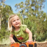 Jucăria este concepută pentru utilizare atât în exterior, cât și în interior, cu anvelope solide care fac față oricărui teren.