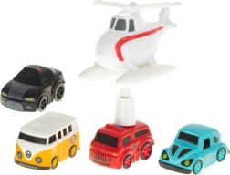 - Pistă, mașină de poliție, mașină de pompieri, autobuz școlar, autoturism, elicopter