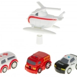 Include trei vehicule: ambulanță, mașină de pompieri și mașină de poliție, permițând simularea diverselor misiuni de salvare și scenarii dinamice.