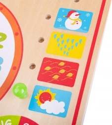 Placa este clar structurată, conține un ceas mare cu ace mobile, indicatori rotativi sau glisanți pentru zile, luni, vreme și anotimpuri. Inscripțiile de bază sunt în limba engleză, astfel încât copilul capătă în mod natural și o expunere lingvistică suplimentară. Produsul este realizat din lemn durabil, obținut responsabil, și este potrivit pentru utilizare zilnică acasă sau la grădiniță.