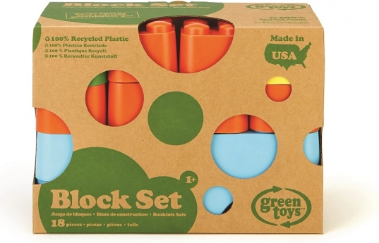 Set de construcție ecologic Green Toys – 18 cuburi sigure din plastic reciclat. Ușoare, rezistente, fără PVC, BPA și ftalați. Potrivite de la 6 luni.