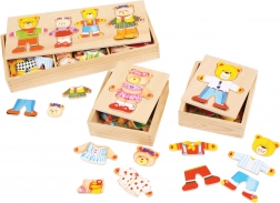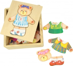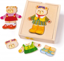 Puzzle de îmbrăcat din lemn, adorabil, pentru cei mici, îi ajută pe copii să combine ținute și expresii ale ursoaicei. Conține 18 piese, o cutie practică cu capac-plăcuță și susține motricitatea fină, coordonarea mână–ochi și vocabularul. Este realizat din lemn de calitate, sigur de la 3 ani și în conformitate cu standardele europene de siguranță.