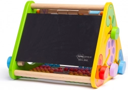 Tăblița de desen, animăluțele și alte elemente rotative mențin atenția copiilor și oferă o paletă variată de activități într-un singur triunghi stabil.