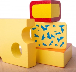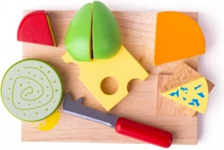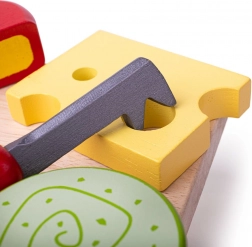Lemnul este materialul principal al acestui set de brânzeturi realizat cu precizie. Copiii pot încerca rolul de bucătar folosind piese de brânză din lemn colorate, care arată ca brânzeturile reale. Setul include nu numai brânzeturi, dar și un cuțit și biscuiți, care servesc pentru o perfectă imitare a servirii brânzeturilor. Piesele din lemn sunt o invitație la joacă creativă și ajută la dezvoltarea motricității fine a copiilor.