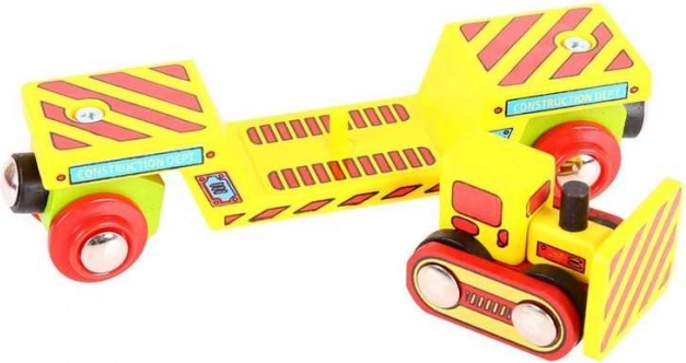 Set distractiv pentru căile ferate din lemn, include un vagon de mare tonaj cu cuplaje magnetice, un buldozer detașabil și două șine. Compatibil cu majoritatea căilor ferate din lemn, realizat din materiale naturale de calitate și susține imaginația și motricitatea fină, fiind un accesoriu grozav pentru orice rețea feroviară.