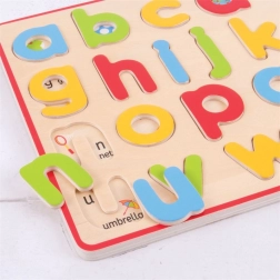 Placă din lemn distractivă cu alfabetul englez mic îi ajută pe copii să descopere într-un mod ludic formele literelor și ordinea lor. Fiecare literă este încastrată în placa de bază și este însoțită de o ilustrație a unui obiect care începe cu acea literă, susținând învățarea vizuală. Fabricată din lemn de calitate și conformă cu normele europene. Dezvoltă îndemânarea, concentrarea și abilitățile de comunicare.