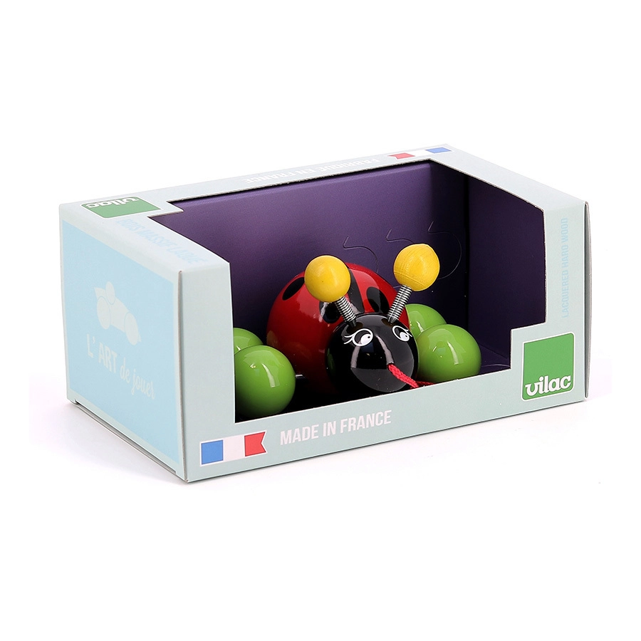 Această gărgăriță clasică de tras, din lemn lăcuit, încântă prin designul colorat, suprafața netedă și antenele elastice care se leagănă voios în timpul tragerii. Datorită roților rotunjite, rularea este lină, iar copiii își antrenează în mod natural coordonarea pașilor și siguranța la mers.