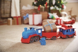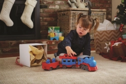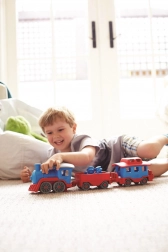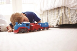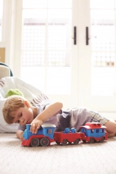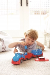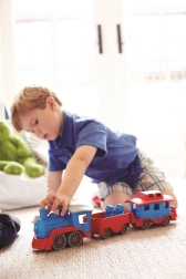 Urcă la bord! Acest tren robust de la Green Toys, cu locomotivă și două vagoane, aduce joacă creativă atât acasă, cât și afară. Este fabricat din 100% plastic reciclat din sticle de lapte, nu conține BPA, PVC sau ftalați și nu are ax metalic sau vopsea exterioară. Include doi controlori ursuleți, iar toate piesele se pot detașa ușor și se pot spăla în mașina de spălat vase.