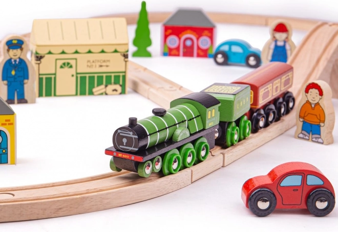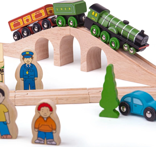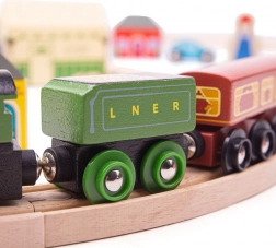 Flying Scotsman este unul dintre cele mai cunoscute trenuri ale epocii sale, iar cu acest set din lemn copiii pot retrăi călătoriile sale celebre. Setul include un tren frumos realizat, care te poartă într-o călătorie nostalgică plină de viaducte și peisaje naturale. Sunt incluse și gări retro, case și mașini de-a lungul traseului.