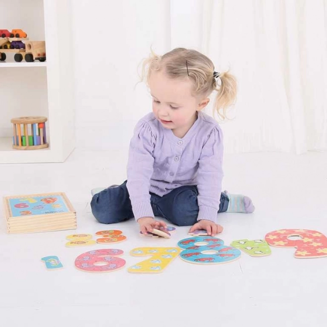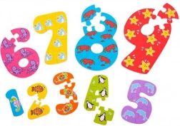 Acest set de puzzle-uri educative îi învață pe copii să recunoască cifrele și să le asocieze cu cantități. Fiecare număr este alcătuit dintr-un număr corespunzător de piese (de exemplu, numărul 4 are patru piese) cu un motiv vesel cu animale, ceea ce sprijină învățarea naturală și plăcerea de a asambla.