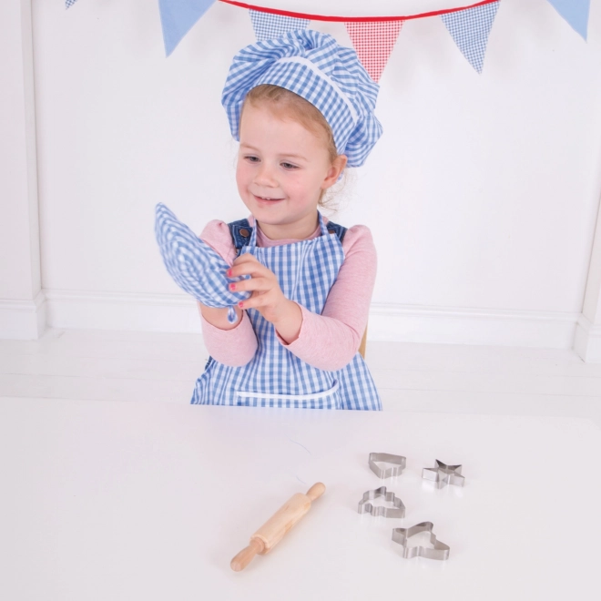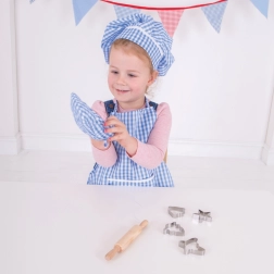 Tinerii bucătari vor adora acest set din bumbac plăcut și albastru deschis pentru coacere și gătit. Include un șorț, mănușă, bonetă de bucătar, sucitor și forme de tăiere, ideal pentru gătit și joacă de rol.